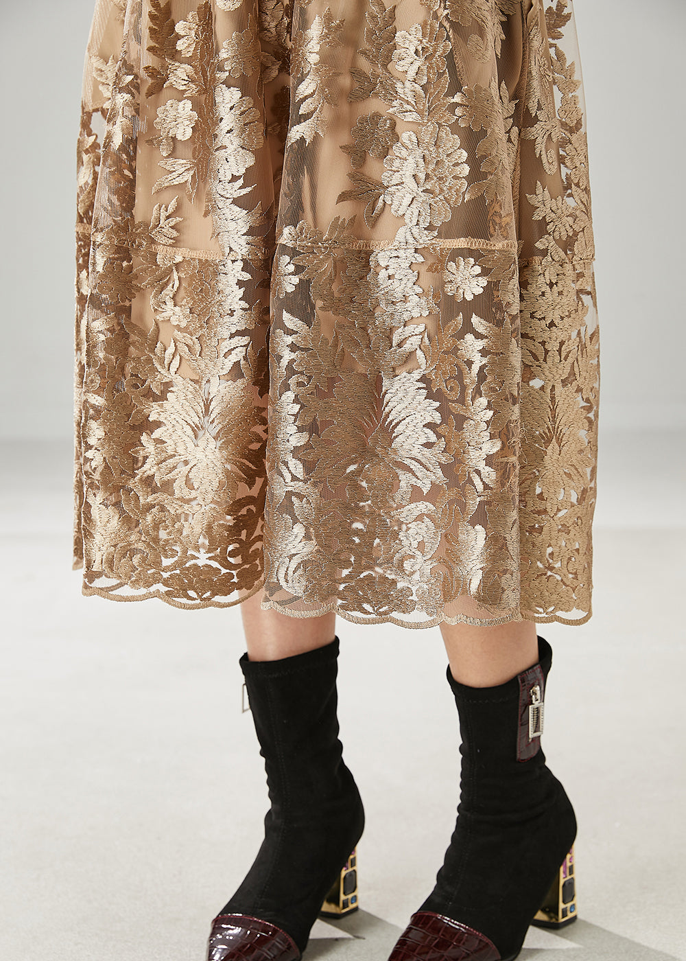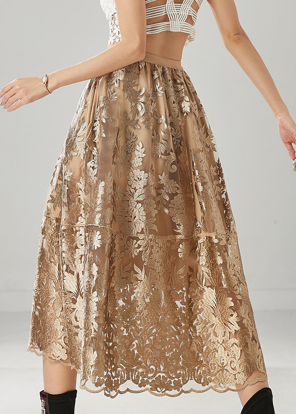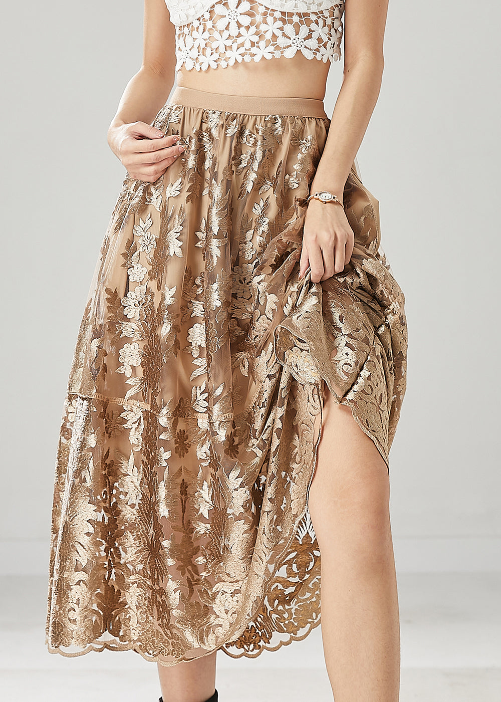 Casual Brown Embroidered Tulle A Line Skirts Spring Fabric: Lace Size & Fit: This garment fits true to size. Length: Size 3XL measures 31.59from waist to hem. Waist:Fitted - elastic waist allows stretch Hip: Loosely Fitted. room for hips. Hand Wash Cold.