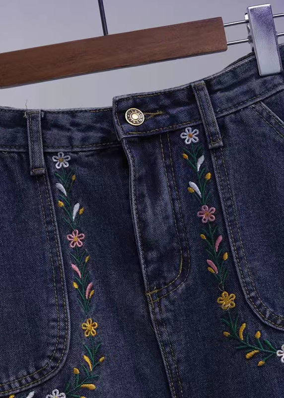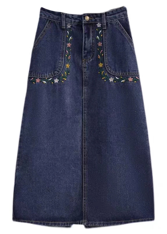 Loose Blue Embroidered Pockets Patchwork Denim Skirt Summer Fabric: Denim Fabric Size & Fit: This garment fits true to size. Length: Size L measures 30.615from waist to hem. Waist:Fitted - very fitted at natural waist Hip: Loosely Fitted. room for hips. Hand Wash Cold.